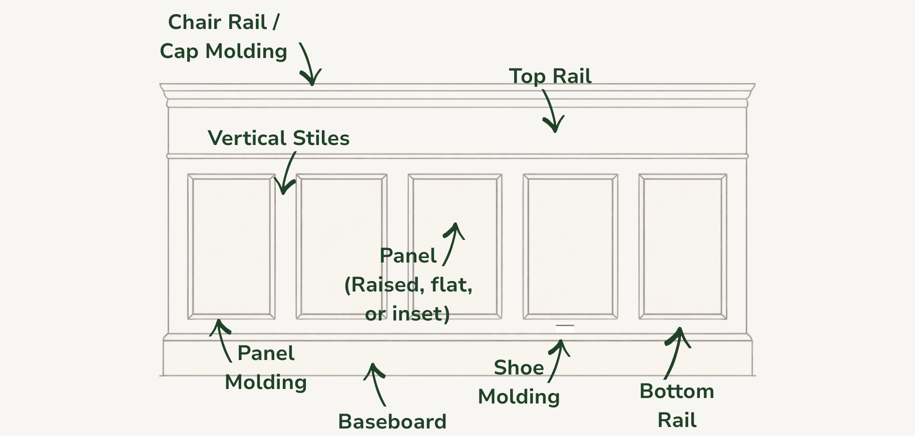 Flat panel wainscoting uses trim to outline panels while keeping the panel face smooth and recessed. The result is clean, architectural, and flexible.