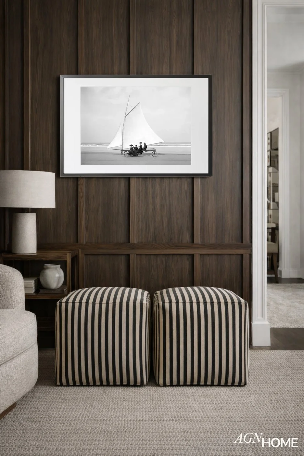 The black-and-white photograph holds the center visually. Its scale is intentional, wide enough to anchor the wall but restrained enough to let the paneling remain visible. Because the palette stays tight—dark wood, soft neutrals, and quiet contrast—the composition feels settled rather than styled.